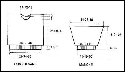 À 32 - 36 - 40 cm de haut. tot. rab. les 19 22 - 23 m. centrales. Cont. ch. côté séparément en rab. côté encolure ts les 2 rgs 1 fs 3 m., 1 fs 2 m.