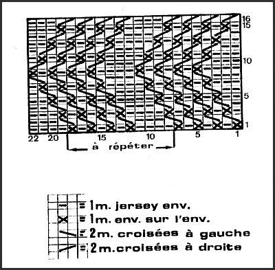 Suivre la grille en tric. le 1er rg sur l'env. du trav. (dont lire la grille de gauche à droite). Après 16ème rg, reprendre au 1er rg. Pour faire 2 m. croisées à gauche et 2 m. croisées à droite, tric. les 2 m. à l'endr.Côtes torses 1/1: aig. # 4.5 sur un nombre de mailles impair: