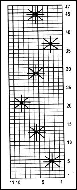 Broder les étoiles à points lancés en vert. À droite, en suivant la grille, (après le 34ème rg, reprendre au 3ème rg), à gauche en sens inverse. Broder de la même manière de ch. côté de la torsade des manches. Le milieu de chaque étoile sera resserré par quelques points lancés. Faire les coutures. Poser le col au point de mailles au bord de l'encolure.