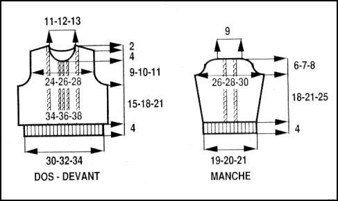 À 9 - 10 - 11 cm de haut. d'emmanchures, rab. les 10 - 12 - 14 m. centrales. Cont. ch. côté séparément en rab. côté encolure ts les 2 rgs 2 fs 3 m., 2 fs 2 m., 3 fs 1 m.