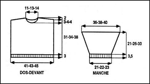 Faire les coutures d'épaules. Poser les manches au point de mailles sur 18 - 19 - 20 cm de part et d'autre des coutures d'épaules. Term. les coutures. Poser le col au point de mailles autour du décolleté.