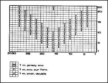 1 m. endr. double: piquer l'aiguille droite au milieu de la m. située sous la m. à tric. et faire 1 m. endr., lâcher ensuite la m. de l'aig. gauchePoint chevron: aig. # 2.5 suivre la grille en tricotant le 1er rang sur l'envers du trav. Après le 22ème rg reprendre au 3ème rg.