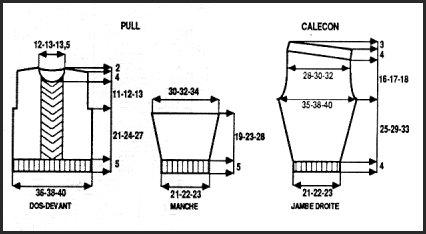 À 11 - 12 - 13 cm de haut. d'emmanchures, rab. les 11 - 15 - 15 m. centrales. Term. ch. partie séparément en rab. côté encolure ts les 2 rgs 1 fs 3 m., 2 fs 2 m., 5 fs 1 m.