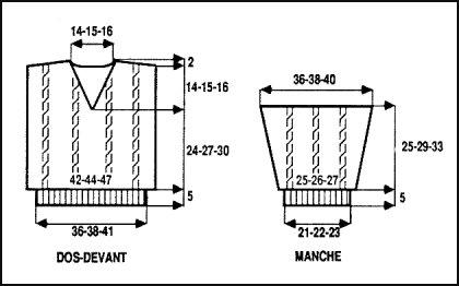 T.10 ans: 2 m. point de blé, 5 m. jersey endr., 6 m. point de blé.), *12 m. torsade, 17 m. point fant.*. Tric. 3 fs de * à *, 12 m. torsade, 7 - 9 - 13 m. point fant. (en tric. en sens inverse du côté droit).Épaules et encolure:
