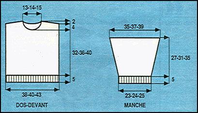Faire les coutures d'épaules. Poser les manches au point de mailles sur 17.5 - 18.5 - 19.5 cm de part et d'autre des coutures d'épaules. Term. les coutures. Poser le col au pont de mailles autour du décolleté.
