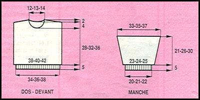 Monter 63 - 67 - 69 m. en marine. Tric. 5 cm en côtes 1/1 en augm. 1 m. au dernier rg. Cont. en suivant la grille sur les 64 -68 - 70 m. obtenues. (T.4 ans commencer au 20ème rg de la grille)