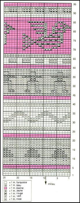 Monter 103 - 109 - 115 m. en marine. Tric. 5 cm en côtes 1/1 en augm. 1 m. au dernier rg. Cont. droit en suivant la grille sur les 104 - 110 - 116 m. obtenues.