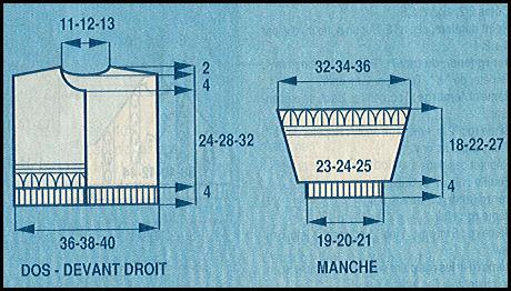 Monter 53 - 57 - 61 m. Tric. 4 cm (20 rgs) en côtes 1/1, en dim. 1 m. au dernier rg pour T.6 ans (= 53 - 57 - 60). Cont. droit point fant. en commençant: