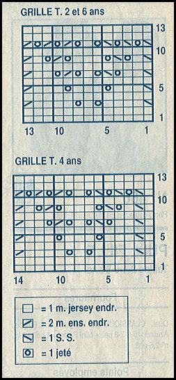 Mais à 15.5 - 19.5 - 24.5 cm de haut. tot., tric. 1 rg jersey env., 2 rgs jersey endr., 1 rg jersey env., 6 rgs jersey endr., 2 rgs jersey env. Puis sur les 93 - 99 - 106 m. obtenues, tric. du 1er rg au 13ème rg de la grille en commençant: