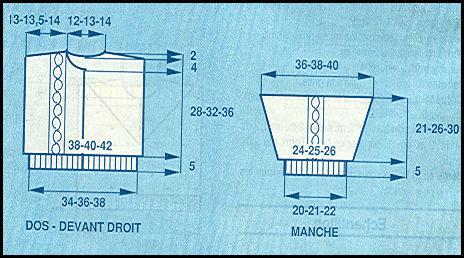 Monter 71 - 79 - 87 m. Tric. 3 cm côtes 1/1, laisser en attente, mais à la bordure droite, à mi-haut. ouvrir 4 boutonnières de 3 m., la 1ère à 5 m. du bord, les autres espacées de 14 - 16 - 18 m.