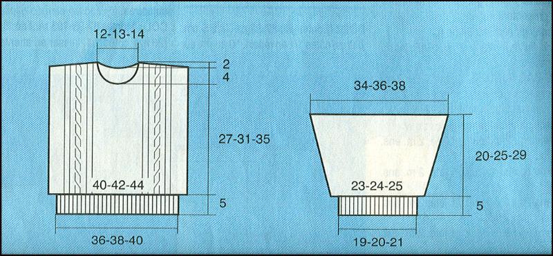 Monter 107 - 113 - 119 m. en bleu. Tric. 6 cm côtes 1/1 en répart. 11 augm. au dernier rg. Cont. droit comme suit sur les 118 - 124 - 130 m. obtenues: 14 - 16 - 18 m. point damiers, 2 m. jersey env., 7 m. jersey endr., 2 m. jersey env., 5 m. torsade de droite, 2 m. jersey, 7 m. j ersey endr., 2 m. jersey env., 36 - 38 - 40 m. poin5 damiers, 2 m. jersey env., 7 m. jersey endr., 2 m. jersey env., 5 m. torsade gaudhe, 2 m. jersey env., 7 m. jersey endr., 2 m. jersey env., 14 - 16 - 18 m. point damiers.