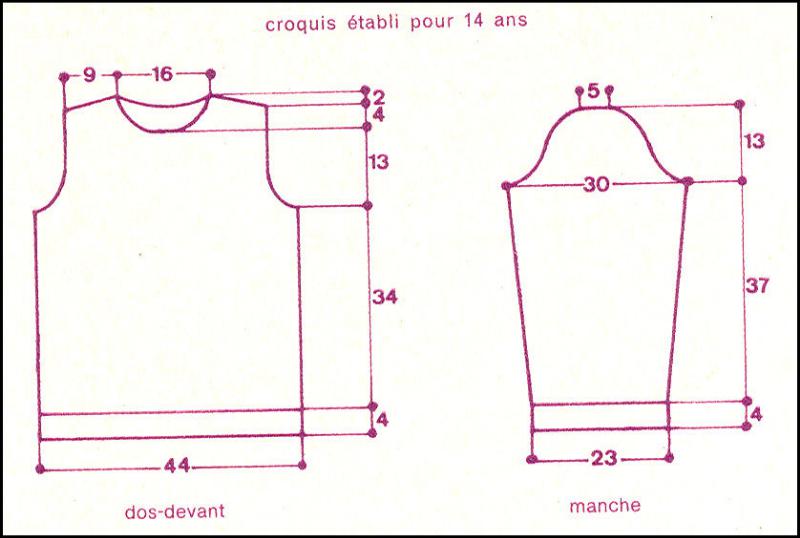Monter 47 - 49 - 51 m. Tric. 4 cm côtes 1/1. Cont. au point fant. (pour T.12 ans, commencer et term. le 2ème rg par 2 m. env. au lieu de 3).
