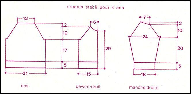 À 29 - 34 - 39 cm de haut. tot., rab. à droite ts les 2 rgs 4 fs 4 - 5 - 5 m. Après les dim. de raglan, fermer les m. rest. en 1 fois.
