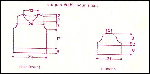 À 7 - 8 - 9 cm de haut. d'emmanchures, rab. les 11 - 12 - 13 m. centrales,. Term. ch. partie séparément en rab. côté encolure ts les 2 rgs 1 fs 4 m., 3 fs 2 m., 2 fs 1 m.