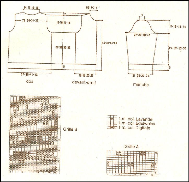 T.14 ans: 1 fs 5 m., 1 fs 3 m., 3 fs 2 m., 2 fs 1 m. Cont. droit, mais à environ 4 - 5 - 6 - 6 cm de haut. d'emmanchures après 3 rgs de blanc, tric. les 34 rgs jacquard "B", term. avec la couleur orange.Épaules et encolure