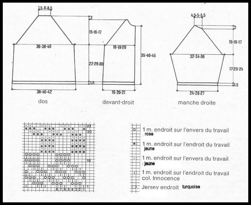 T.4 et T.6 ans: la m. 2 de la grille. Cont. en dim. côté gauche 2 fs 1 m. ts les 8 - 9 - 10 cm.Raglan