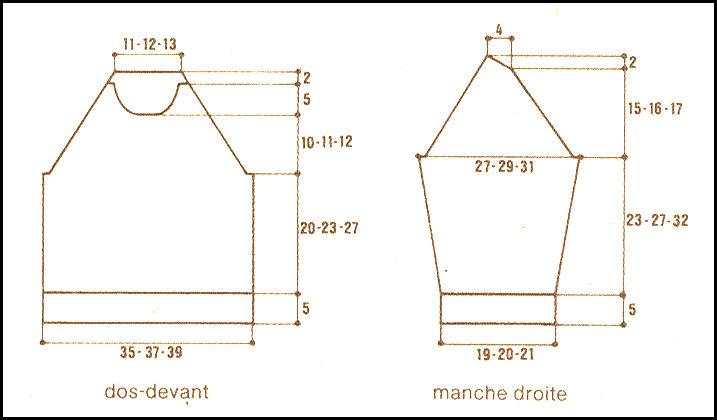 À 10 - 11 - 12 cm de haut. de raglan, fermer les 13 -13 - 15 m. centrales. cont. ch. côté séparément en rab. encolure ts les 2 rgs 1 fs 3 m., 1 - 2 - 2 fs 2 m., 3 fs 1 m.