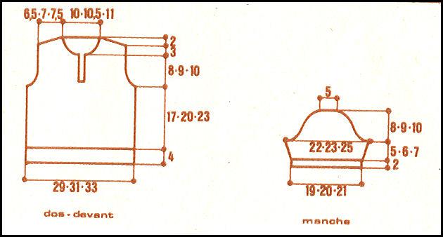 Mais à 1.5 cm de haut. d'emmanchures, tric. jersey rayé comme suit: *2 rgs turquoise, 2 rgs blanc, 2 rgs jaune, 2 rgs blanc* Répéter de * à * jusqu'en haut (il reste 74 - 80 - 84 m. après les diminutions)Épaules et encolure