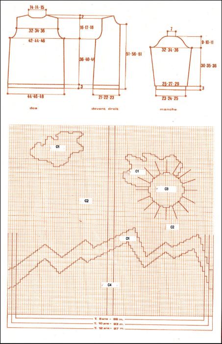 Jersey endroit: aig. # 4 mmJacquard: aig. # 4 mm, en suivant la grille; après le jacquard terminer en C2. Les rayons du soleil seront à rebroder au point de chaînette