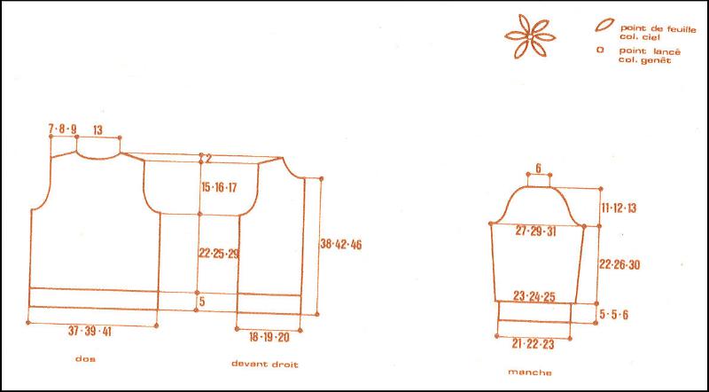 À 38 - 42 - 46 cm de haut. tot., rab. à droite ts les 2 rgs 1 fs 3 - 3 - 4 m., 1 fs 2 m., 1 - 2 - 2 fs 1 m.