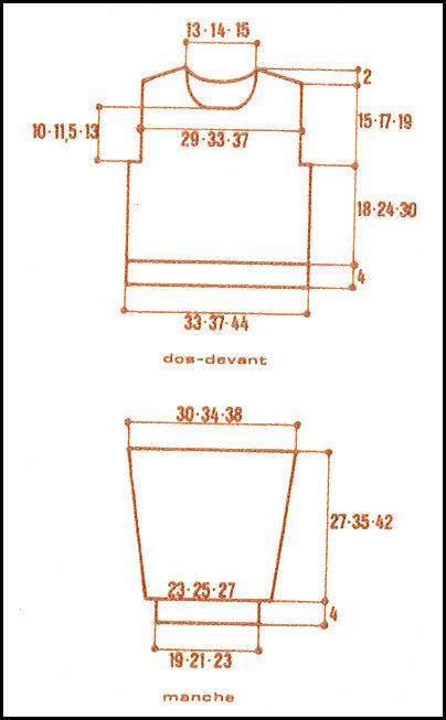 Monter 49 - 53 - 57 m. Tric. 4 cm en côtes 1/1, en répart. 10 augm. au dernier rg. Cont. point fant. sur les 59 - 63 - 67 m. obtenues en commençant le 1er rg par