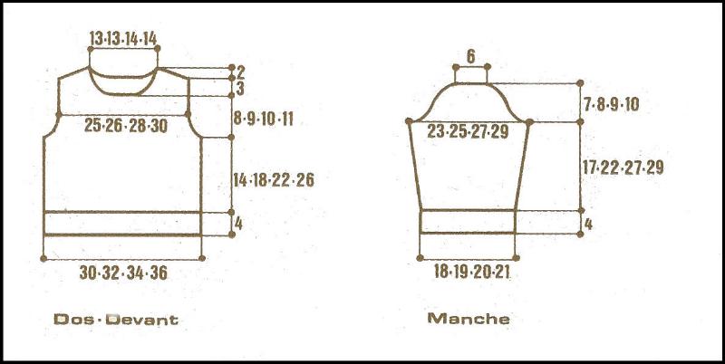 À 8 - 9 - 10 - 11 cm de haut. d'emmanchures, fermer les 9 - 9 - 11 - 11 m. centrales. Cont. ch. côté séparément en rab. côté encolure ts les 2 rgs: 1 fs 3 m., 1 fs 2 m., 3 fs 1 m.