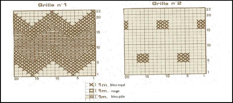 Monter en rouge 85 - 89 - 95 m. tric. 5 cm en côtes 1/1. Cont. droit en tric. 1 fs la grille # 1. Cont. grille # 2, au rang 22, reprendre au 1er rang (centrer la m. 16, commencer alors T8 ans: à la m. 4; T.10 ans: à la m. 2; T.12 ans: à la m. 9)