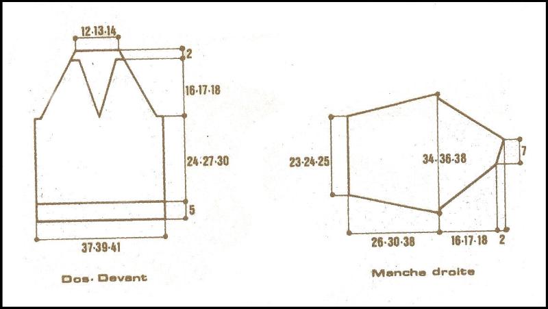T.8 ans: 1 fs 10 m. tric. grille # 2 en commençant au 3ème rg, répéter ensuite 1 fs cette grille. Tric. les 22 rgs de la grille # 1 puis reprendre grille # 2 en sens inverse. Agum. à gauche 7 fs 7 m. ts les 2 rgs cont. droit (= bas de manche). Simultanément à droite tric. 2 rgs droit puis augm. ts les 2 rgs *1 fs 1 m., 2 fs 2 m.* Répéter 4 fs de * à * et 8 fs 2 m. puis 4 fs 1 m. ts les 5 rgs. Tric. 2 rgs droit puis dim. ts les 2 rgs 19 fs 2 m., 2 fs 1 m. Tric. 2 rgs droit mais à gauche lorsqu'on a 91 rgs dim. ts les 2 rgs 7 fs 7 m., fermer les 10 m. rest. en 1 fois.