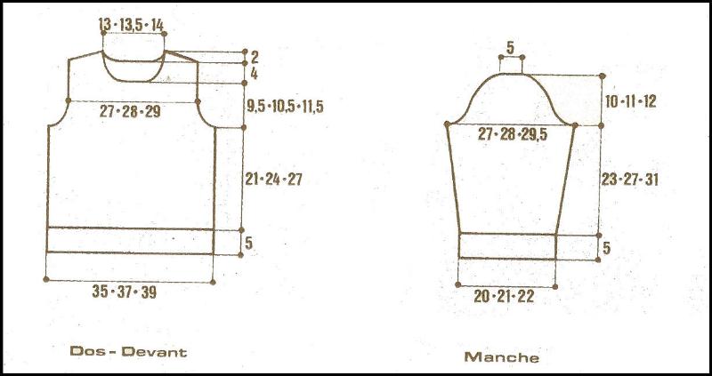 À 9 - 10 - 11 cm de haut. d'emmanchures, après un 2ème rg du point fant. "B", rab. les 12 - 14 - 16 m. centrales. Terminer chaque partie séparément en rab. côté encolure ts les 2 rgs 1 fs 5 m., 3 fs 2 m., 4 fs 1 m.