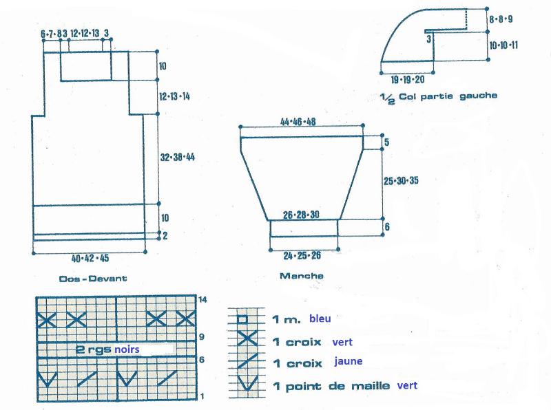 À 12 - 13 - 14 cm de haut. d'emmanchures, tric. 2 rgs endr. vert, 2 rgs endr. noir, 2 rgs endr. bleu, 6 rgs jersey endr. noir, 2 rgs endr. vert, 6 rgs jersey endr. bleu, 2 rgs endr. noir, 6 rgs jersey endr. bleu, 2 rgs endr., bleu, 2 rgs endr. noir, 2 rgs endr. vert, puis fermer les 71 - 77 - 83 m. rest. en 1 fois pour les épaules et l'encolure.