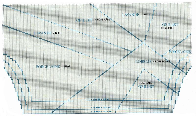 Jacquard: aig. # 3 mm, suivre la grille.Tricoter avec plusieurs pelotes. Bien croiser les fils sur l'envers du travail à chaque changement de couleur.