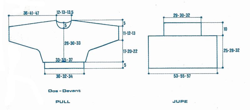 Comme le dos, mais former l'encolure à 31 - 35 - 38 cm de haut. tot. en rab. les 11 - 13 - 15 m. centrales. Term. ch. partie séparément en rab. côté encolure ts les 2 rgs: 1 fs 4 m., 2 fs 2 m., 4 fs 1 m.