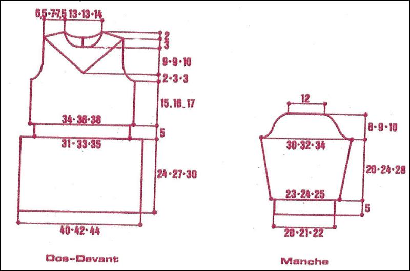 À 11 - 12 - 13 cm de haut. d'emmanchures, rab. les 13 - 13 - 15 m. centrales. Cont. ch. côté séparément en rab. côté encolure ts les 2 rgs 1 fs 4 m., 1 fs 3 m., 2 fs 2 m., 3 fs 1 m.
