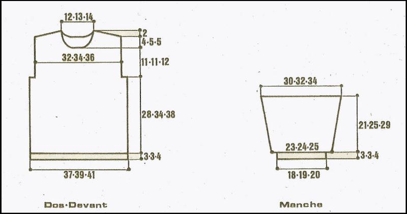 À 24 - 30 - 36 cm de haut. tot., cont. en tric. du 9ème au 53ème rg de la grille, puis répéter jusqu'en haut du 54ème au 61ème rg.Emmanchures