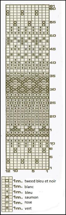 Monter 121 - 125 - 129 m. en tweed. Tric. 2.5 - 2.5 - 3 cm en côtes 1/1. Cont. droit en jacquard en commençant au 9ème rg de la grille par 1 m. lis., puis la m. 1.