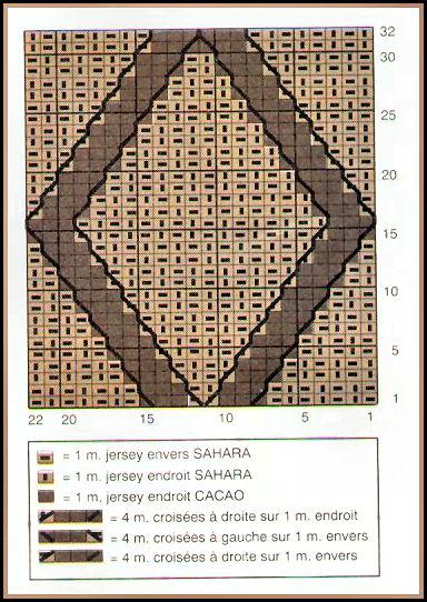 À 15 - 17 - 21 - 21 cm de haut. tot. environ, après un 6ème rg torsade, cont. en suivant la grille en centrant le losange sur la torsade. (selon le point de blé, tric. si nécessaire 2 m. jersey env. au lieu d'une de ch. côté du losange). Après le 32ème rg de la grille, cont. torsade au dessus du losange en commençant au 5ème rg. De part et d'autre, tric. 1 m. jersey env. sahara et les autres m. point de blé sahara.