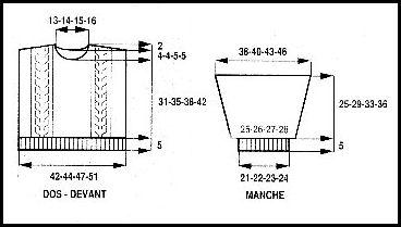 Monter 83 - 87 - 93 - 101 m. Tric. 5 cm côtes 1/1 en répart. 10 augm. au dernier rg. Cont. droit comme suit sur les 93 - 97 - 103 - 111 m. obtenues: