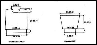T.8 ans: commencer par 1 m. env., 1 m. endr. côtes anglaises puis les explications. Augm. et terminer à la même hauteur et comme pour la manche droite (= 71 - 75 - 79 m.).