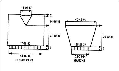 À 46 - 50 - 54 cm de haut. tot., rab. les 15 - 17 - 19 m. centrales. Cont. ch. côté séparément en rab. côté encolure ts les 2 rgs 2 fs 3 m.