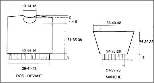 T.10 ans: 20 fs 1 m. alternativement ts les 4 et 6 rgs, 2 fs 1 m. ts les 4 rgs À 30 - 34 - 38 cm de haut. tot., laisser les 105 - 111 - 117 m. obtenues en attente.