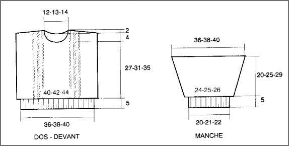 Monter 111 - 117 - 123 m. Tric. 5 cm côtes 1/1 en répart. 31 augm. au dernier rang. Cont. droit comme suit sur les 142 - 148 - 154 m. obtenues: 25 - 28 - 31 m. point damiers (pour T.4 et 8 ans term. par 1 m. env. au lieu de 4 au 3ème rang), 2 m. jersey env., 4 m. torsade, 14 m. point fant., 4 m. torsade, 2 m. jersey env., 40 m. point damiers (pour T.4 et 8 ans commencer et term. par 1 m. env. au lieu de 4 au 3ème rang), 2 m. jersey env., 4 m. torsade, 14 m. point fant., 4 m. torsade, 2 m. jersey env., 25 - 28 - 31 m. point damiers (pour T.4 et 8 ans commencer par 1 m. env. au lieu de 4 au 3ème rang).