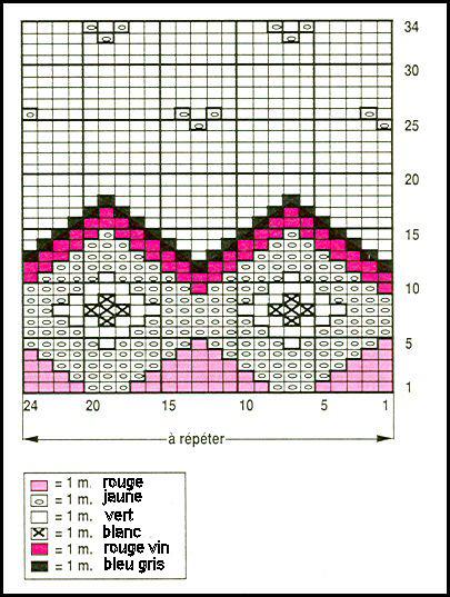 Jacquard: aig. # 3.5, suivre la grille. Après le 34ème rg, reprendre au 19ème rg. Les petits motifs peuvent être rebrodés.