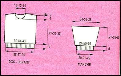 Monter 51 - 53 - 55 m. en vert. Tric. 5 cm en côtes 1/1 en répart. 10 agum. au dernier rg. Cont. Jacquard comme au dos sur les 61 - 63 - 65 m. obtenues en commençant: