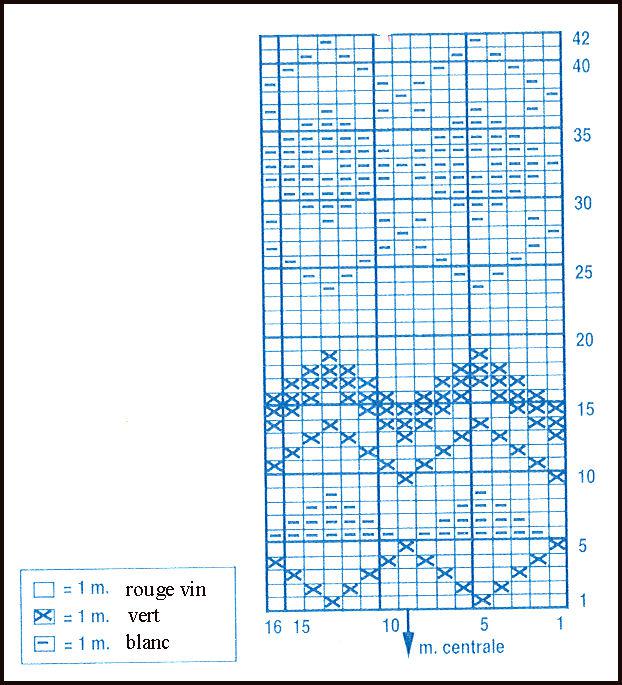 Monter 97 - 103 - 107 - 113 mailles en rouge vin. Tric. 5 cm en côtes 1/1 en répart. 10 augm. au dernier rang.. Cont. droit jersey endr. sur les 107 - 113 - 117 - 123 m. obtenues; mais à 7 - 8 - 9 -10 cm de haut. tot., cont. jacquard en commençant: