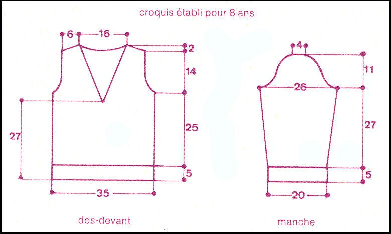 Monter en blanc 48 - 50 - 52 m. Tric. côtes 2/2 comme au dos, cont. point fant. en blanc en augm. de ch. côté 7 - 7 - 8 fois 1 m. ts les 4 cm.