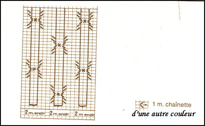 1er rg: 2 m. endr., *4 m. env., 2 m. endr.* Répéter de * à *. À ch. rg suiv. tric. comme les mailles se présententBroderie: broder au point de chaînette avec 1 crochet ou 1 aig. les motifs en suivant la grille