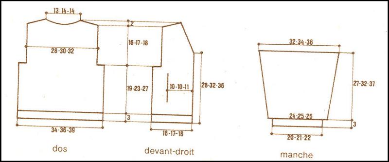 À 28 - 32 - 36 cm de haut. tot., rab. à droite 8 - 9 - 9 fs 1 m. ts les 4 rgs.