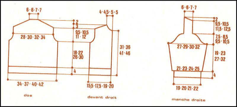 Monter 41 - 47 - 51 - 55 m. Tric. 4 cm en côtes 1/1. Cont. point fant. en faisans 1 augm. au 1er rg répartis comme suit: 7 - 9 - 9 - 11 m. point de claie, 1 m. env., 2 m. torsade, 18 m. losange, 2 m. torsade, 1 m. env., 11 - 15 - 19 - 21 m. point de claie.