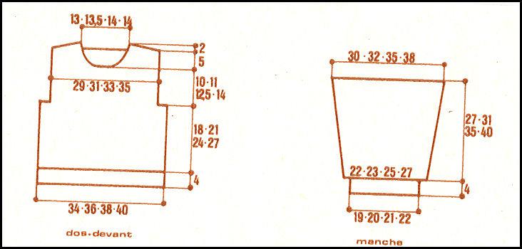 À 10 - 11 - 12.5 - 14 cm de haut. d'emmanchures, rab. les 10 - 12 - 13 - 13 m. centrales. Term. ch. partie séparément en rab. côté encolure ts les 2 rgs 1 fs 4 m., 3 fs 2 m., 2 fs 1 m.
