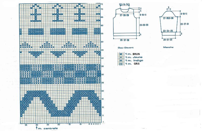 Jersey endroit: aig. 3 mm, suivre la grille. Après le 73ème rang, reprendre au 1er rg mais en remplaçant le brun par bleu et le bleu par brun.
